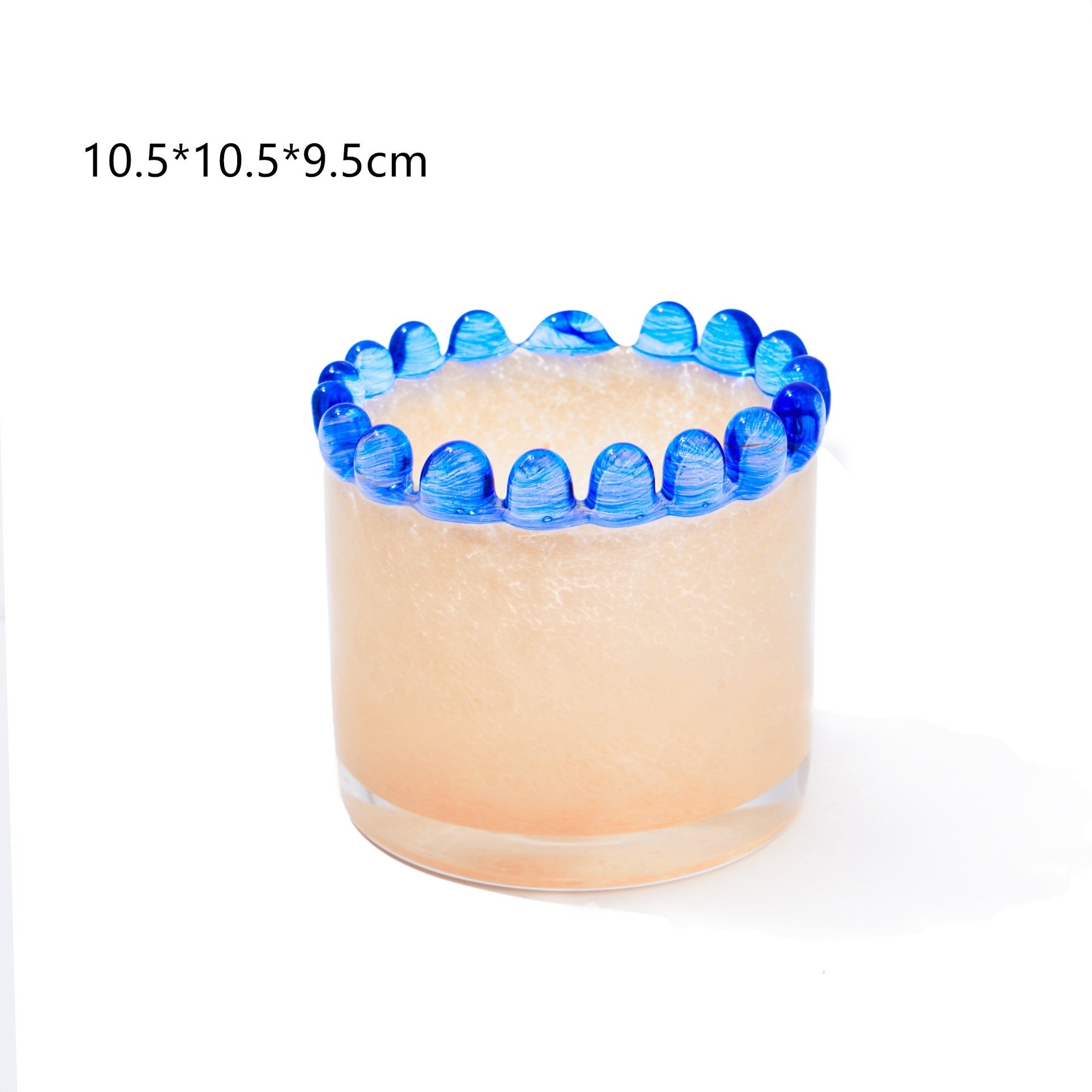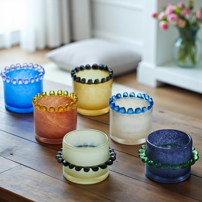 Features a vibrant, colored glass cylinder shape with a unique scalloped edge—delicate raised glass beads encircle the rim, adding a sophisticated touch and tactile detail. -